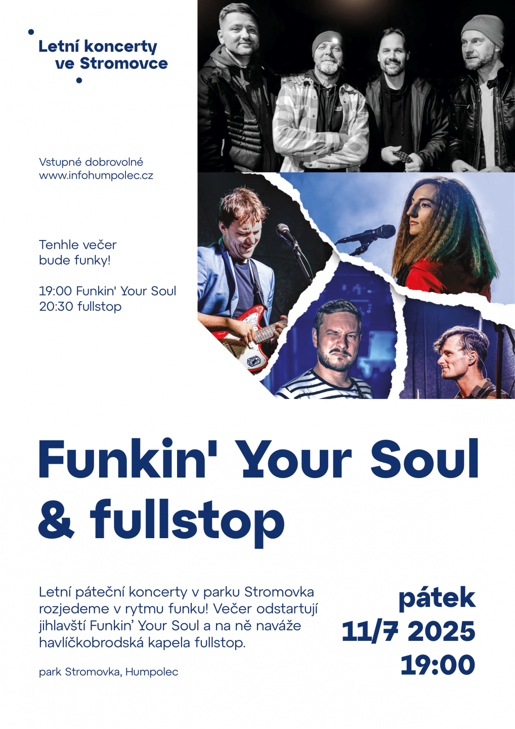Letní páteční koncerty v parku Stromovka rozjedeme v rytmu funku! Večer odstartují jihlavští Funkin’ Your Soul a na ně naváže havlíčkobrodská kapela fullstop. Tenhle večer bude funky!