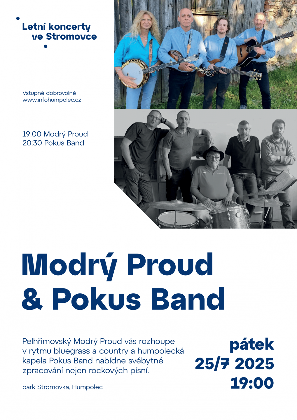 Pelhřimovský Modrý Proud vás rozhoupe v rytmu bluegrass a country a humpolecká kapela Pokus Band nabídne svébytné zpracování nejen rockových písní.