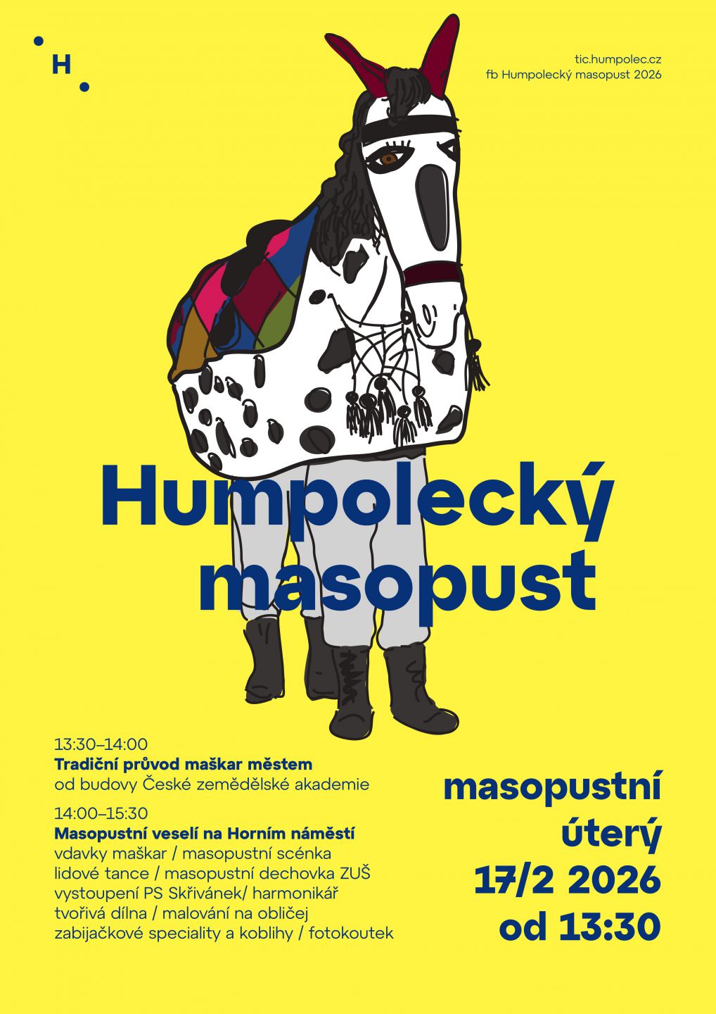 Na masopustní úterý 17/2 se můžete těšit na tradiční Humpolecký masopust, který průvodem přes město zahájí ve 13:30 držitel této tradice Česká zemědělská akademie, a vy se můžete přidat také.