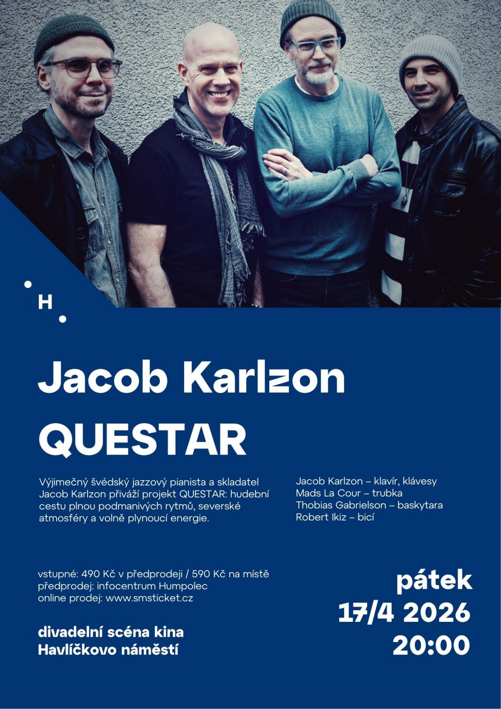 Výjimečný švédský jazzový pianista a skladatel Jacob Karlzon přiváží projekt QUESTAR: hudební cestu plnou podmanivých rytmů, severské atmosféry a volně plynoucí energie. V rámci evropského turné má v ČR jen dvě zastávky, jedna z nich je právě v Humpolci!