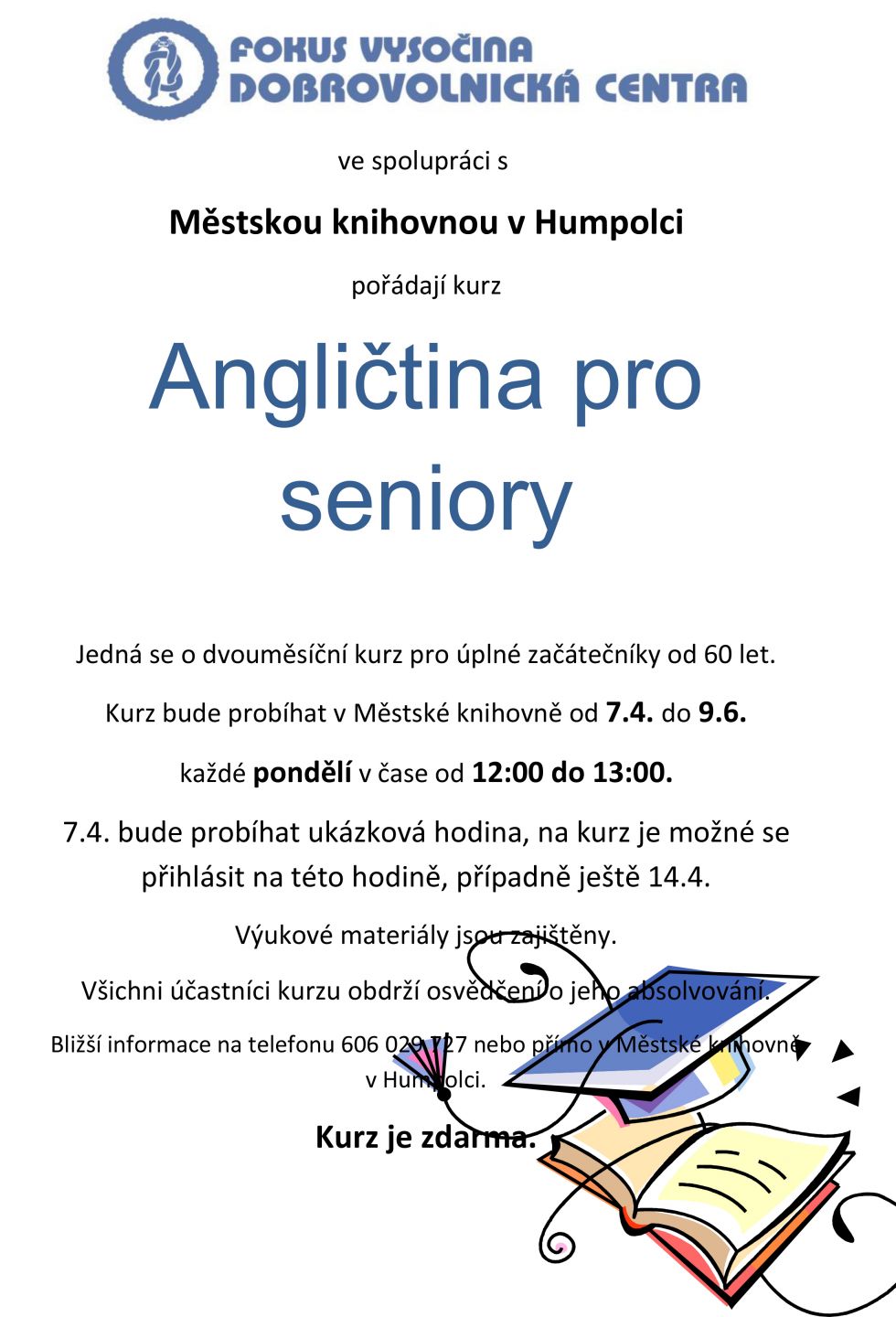 Kurz angličtiny pro seniory od šedesáti let pořádá FOKUS Vysočina ve spolupráci s Městskou knihovnou v Humpolci každé pondělí. Vstup zdarma.
