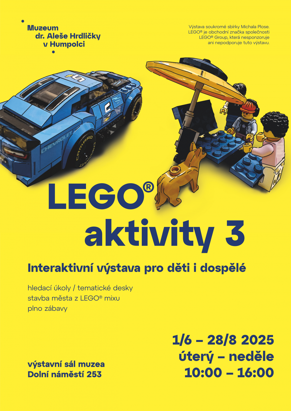 Humpolecké muzeum otevřelo 1. června, jeko dárek k Mezinárodnímu dni dětí, novou výstavu LEGO AKTIVITY 3. Jejím autorem je dlouholetý sběratel lega Michal Plos z Českých Budějovic. Na výstavě jsou k vidění nejen běžné stavebnice, ale i řada zajímavostí, které nejsou v obchodech k dostání. Obdivovat tak můžete různé dopravní prostředky včetně lodí, draky, roboty, figurky i filmové a pohádkové stavby. Kromě toho vás čeká velká herna, tematické desky a plno zábavy. A protože je výstava určena především pro děti, které si rády hrají, jsou součástí výstavy „pískoviště s kostičkami“, kde mohou děti předvést svoji kreativitu a šikovnost při tvoření objektů podle jejich fantazie.
