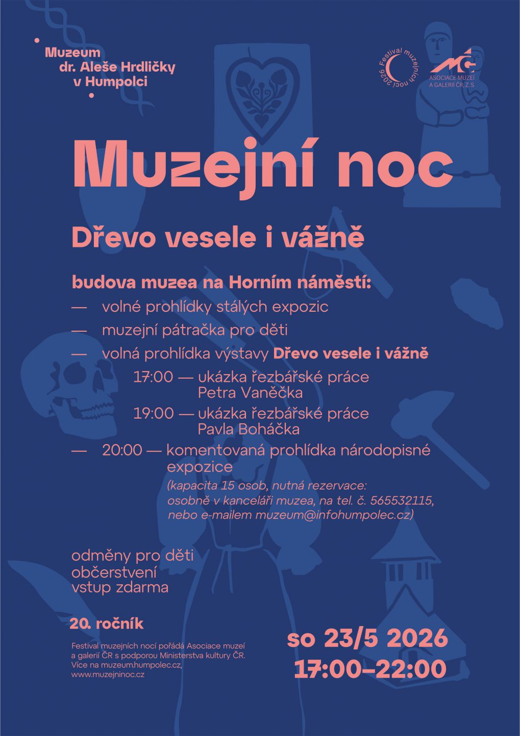 V sobotu 23. května 2026 se muzeum jako každoročně zapojí do celorepublikového Festivalu muzejních nocí. Letošní program se ponese v tématu „Dřevo vesele i vážně“, které propojí hravost, řemeslnou zručnost i tradiční materiál, jenž provází člověka odnepaměti.