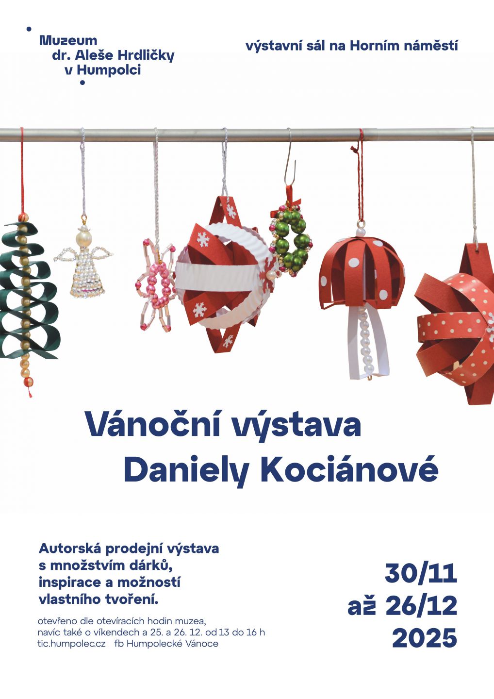 Na tadiční vánoční výstavě Daniely Kociánové uvidíte vánoční dekorace, malované sklo, dekorativní pečivo, perníčky, ozdoby ze slámy, papíru, korálků… Během výstavy si můžete vyzkoušet různé výtvarné techniky a sami si tak něco vyrobit.