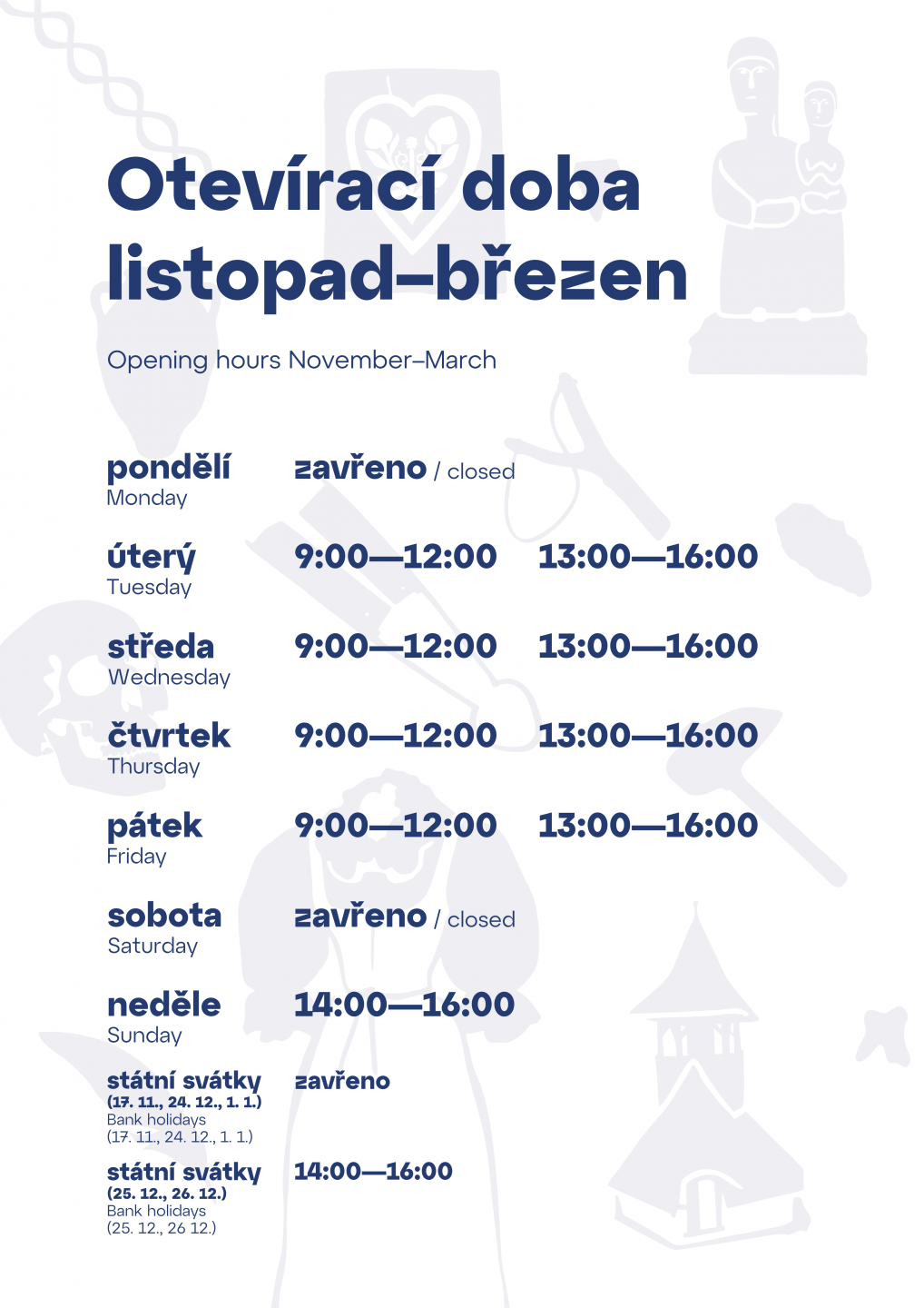 Poslední prohlídka expozic 30 minut před zavírací dobou.